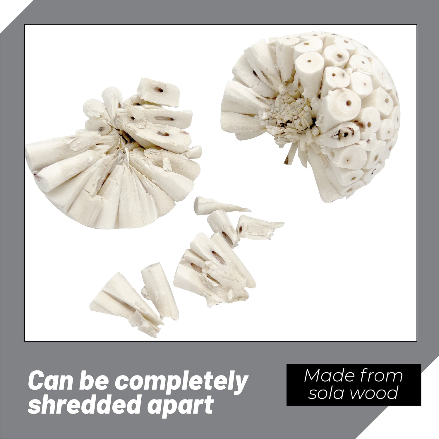 Each ball measures approximately 4 inches in diameter and is made from soft, fibrous sola wood—a bird-safe material ideal for shredding. Their open texture allows birds to dig in, grip, and tear pieces apart with ease. These balls are lightweight, making them easy for birds to toss, manipulate, or carry around during play.