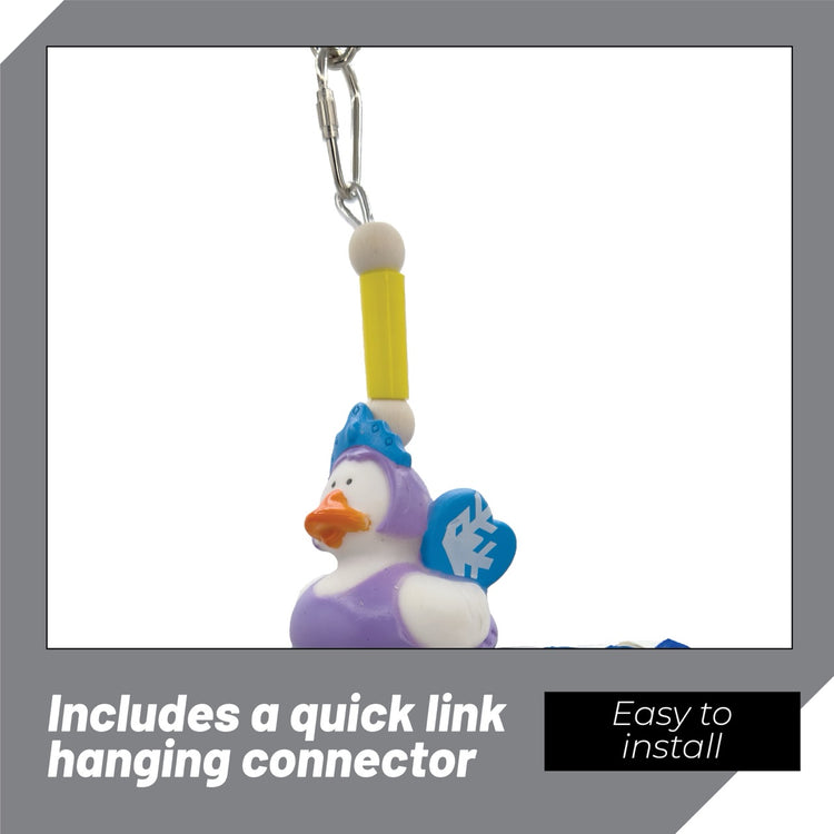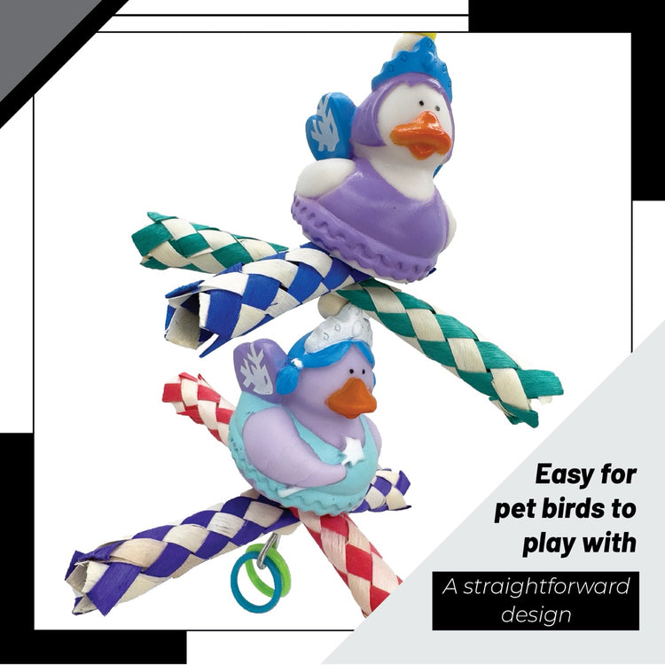 Starting from the top, a secure quick link connector makes hanging the toy easy and safe. A durable metal wire runs through the toy’s core, anchoring all its playful elements. The main feature includes two lightweight rubber ducks—soft, squeezable, and amusing for birds to peck at. Between them, brightly colored bamboo finger traps offer satisfying shredding potential, perfect for birds who enjoy pulling things apart. At the base, two dangling plastic rings provide additional texture and light tugging fun.